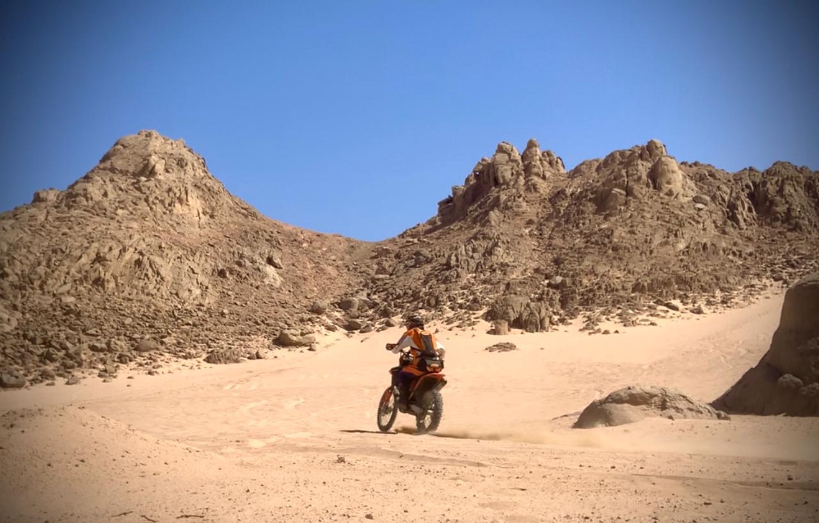 Nic bardziej mylnego. Góry, skały i piaski na obrzeżach jednego z najbardziej znanych kurortów, jakim bez wątpienia jest Hurghada, dają niezliczone możliwości wypraw. Paolo w swoich KTM-ach zamontował akcesoryjne powiększone zbiorniki, żeby bezpiecznie zapuszczać się w dalekie trasy, gdzie odwiedzić możemy prawdziwe wioski Beduinów i spotkać ich w na postoju, gdzie palą ognisko rozniecane wielbłądzimi odchodami.