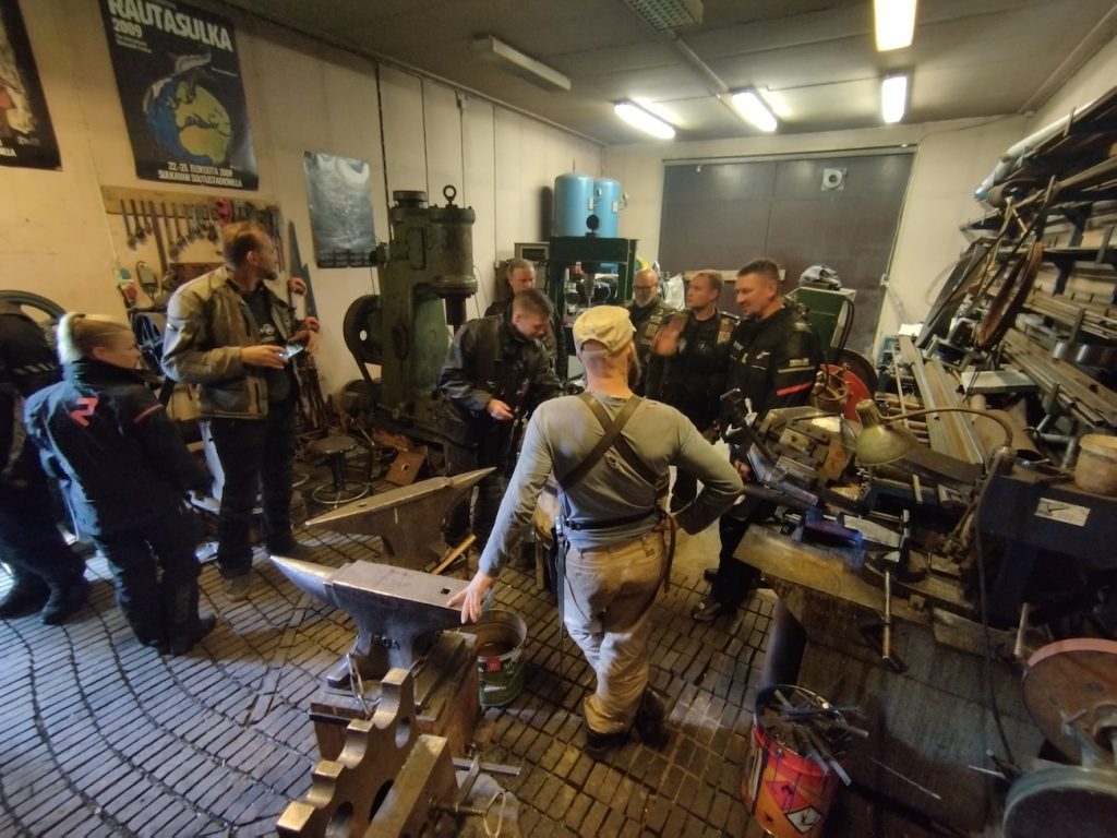 Kolejny etap trasy, to wizyta u kowala, która długo zapadnie wszystkim w pamięci. Po obejrzeniu kuźni tego artysty, na odchodne zadał nam pytanie, czy chcemy zobaczyć jego motocykle. No panie, dwa razy powtarzać nam nie trzeba. Gdy weszliśmy do niepozornej z zewnątrz piwnicy, oczom ukazał się nam motocyklowy raj. W wolnym czasie facet składa, remontuje, sam dorabia części do swoich Nortonów, którymi następnie ściga się w wyścigach ulicznych. Koledzy chodzili przy nich na kolanach, jak przed świętymi figurami, dotykali, głaskali i niemal lizali każdą część tych maszyn. Samo pomieszczenie wypełnione było artefaktami z epoki świetności tych maszyn – plakaty, puszki po olejach, tablice, gadżety itp. Coś pięknego.