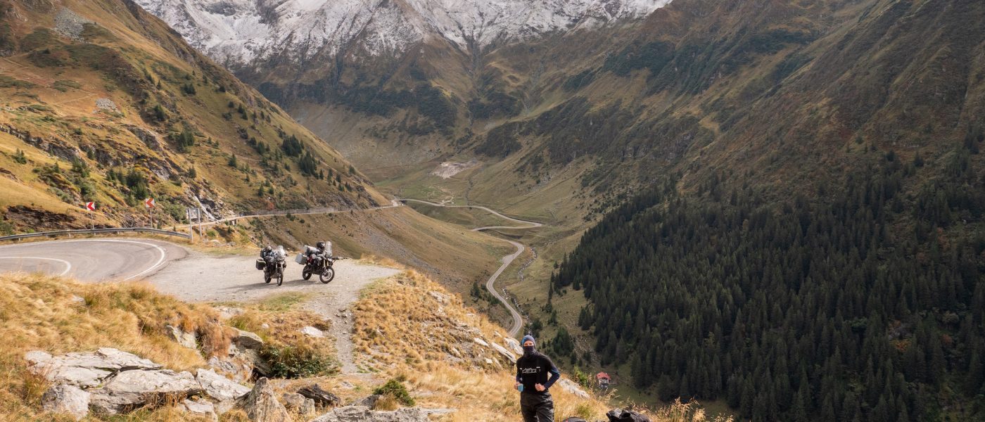 Tamtejsza sceneria aż prosiła się o ujęcia z drona. Z lotu ptaka świat wygląda zupełnie inaczej. Jeden ze strażnik w strzegących tamy chciał wiedzieć, do jakich cel w potrzebne jest mi nagranie, gdyż jest to obiekt strategiczny. Rozmowa przebiegła jednak dość spokojnie, po czym kontynuowaliśmy naszą motocyklową wspinaczkę. Sezon jesienny miał ten plus, że na trasie nie było praktycznie nikogo. Mogliśmy zatem tworzyć dobre ujęcia do film w zatrzymując się i zostawiając kamerę w różnych miejscach. Tomek zaliczył w tym miejscu małą wywrotkę. Nic poważnego się nie stało, porysował tylko kufer. Zabrakło mu kilku centymetrów w nodze, gdy zawracał motocyklem. Moment ten zarejestrowała kamera i możecie go zobaczyć choćby na moim kanale „Zulak MotoADV”.