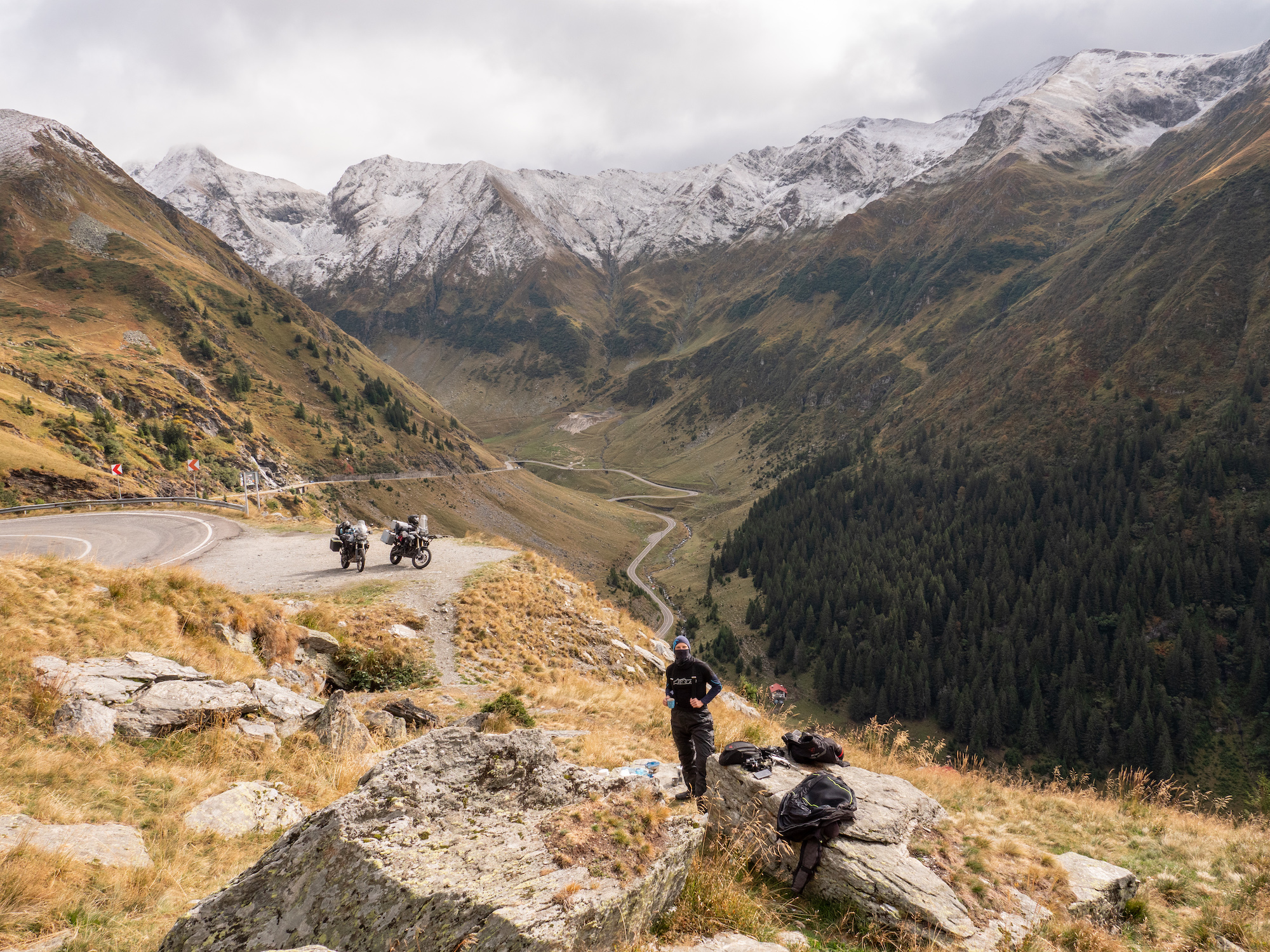 Im wyżej wyjeżdżaliśmy, tym więcej wyłaniało się wysokich, ośnieżonych szczytów górskich. Uroku okolicy dodawały pasące się owce i ogromne wodospady spływające ze zboczy. Chłodne powietrze mocno pobudzało, lecz w żołądkach pojawił się głód. Miejsc na postój było tu sporo, w tym jedno przy ostrym zakręcie. Na skałkach kilka metrów od motocykli przygotowaliśmy śniadanie, które z bajkowym widokiem na panoramę Gór Fogaraskich smakowało mi podwójnie. Przy okazji podjechał do nas motocyklista, jak się okazało z Polski. Fajna sprawa spotkać swojego tyle kilometr w od domu. Kiedy skończyliśmy pauzę na posiłek, ruszyliśmy dalej. Czekał na nas tunel Capra-B lea Lac, za którym gęsta mgła przeniosła nas w zupełnie inny, zimowy klimat.