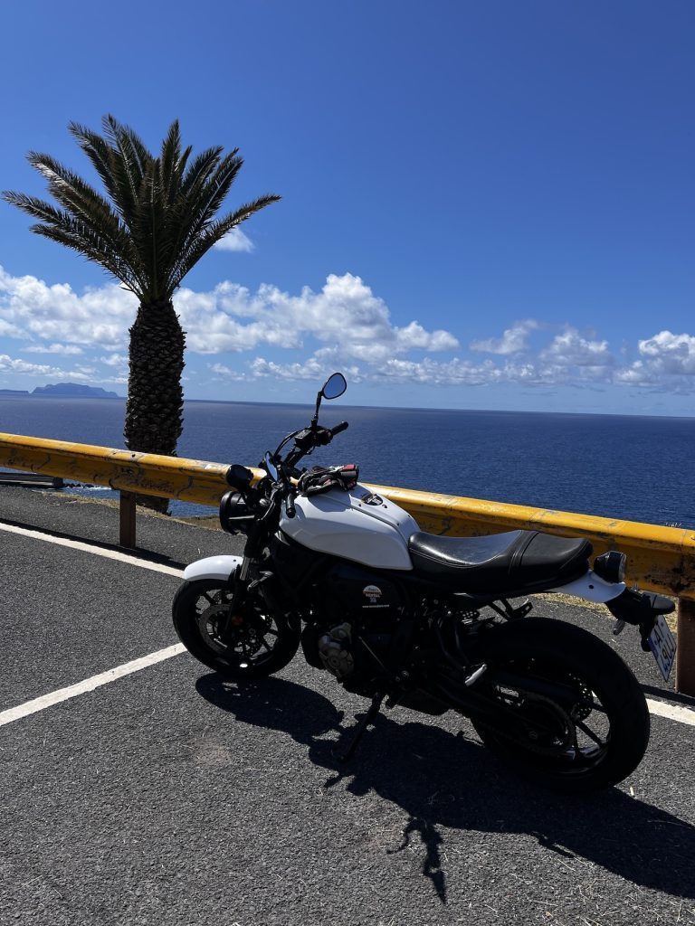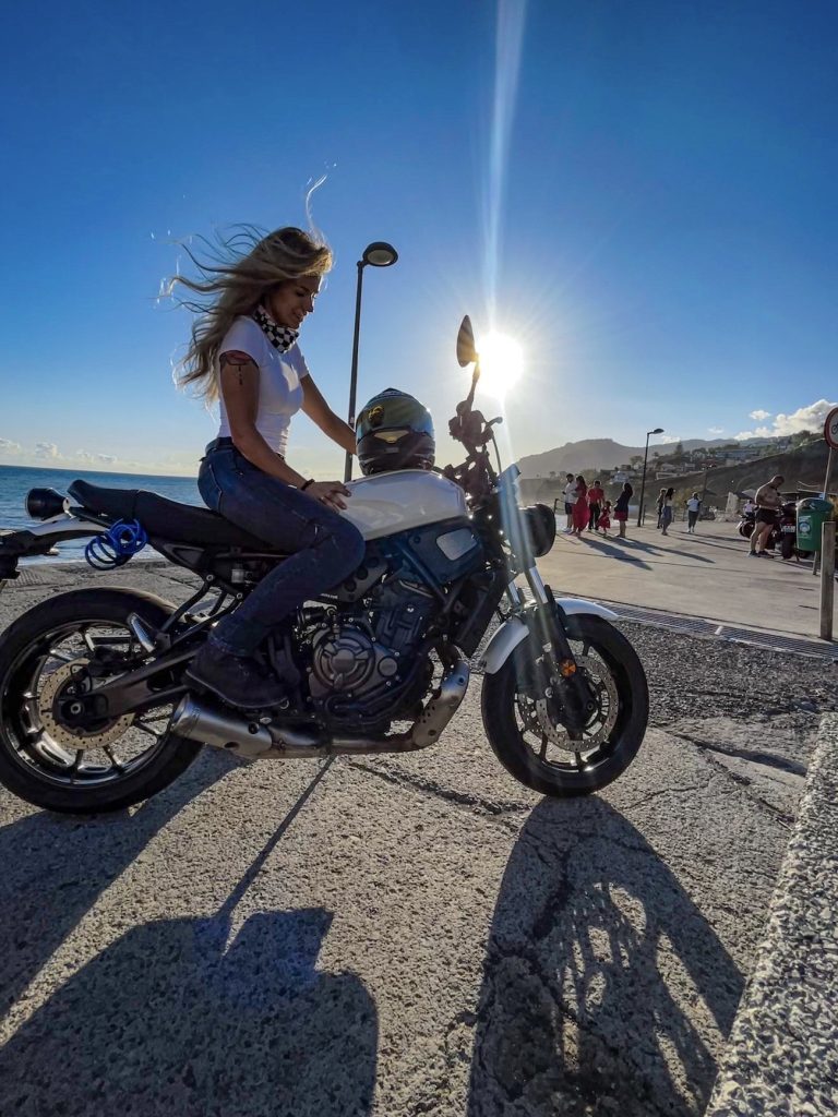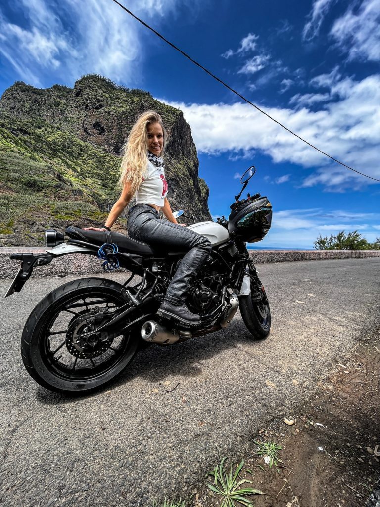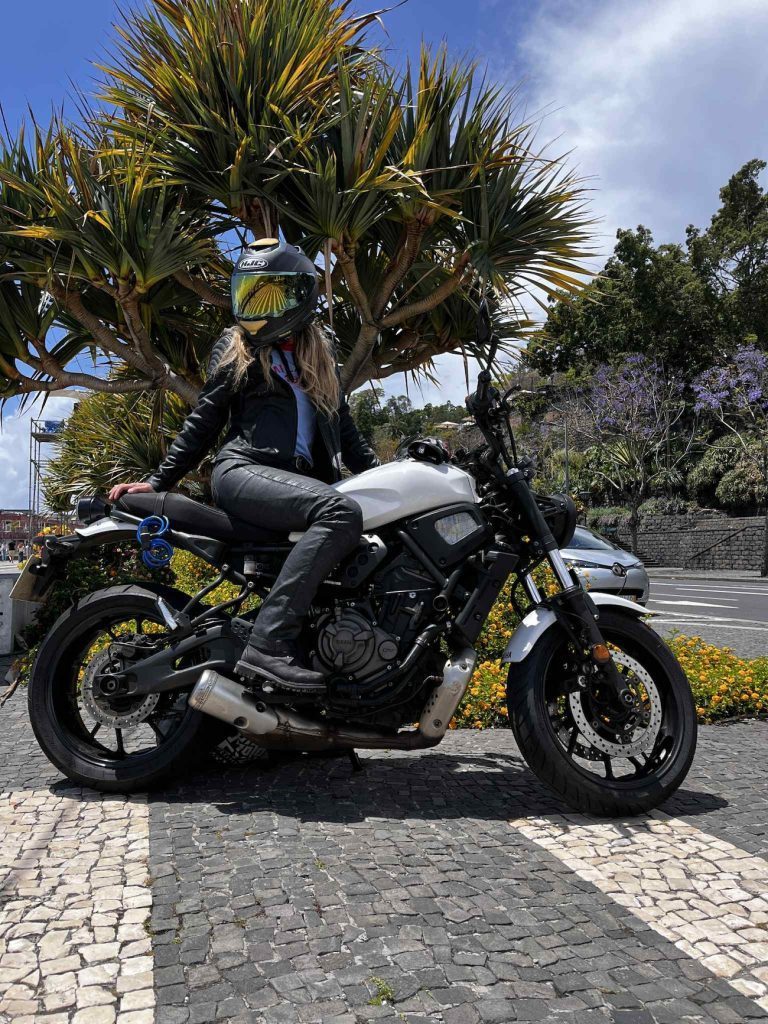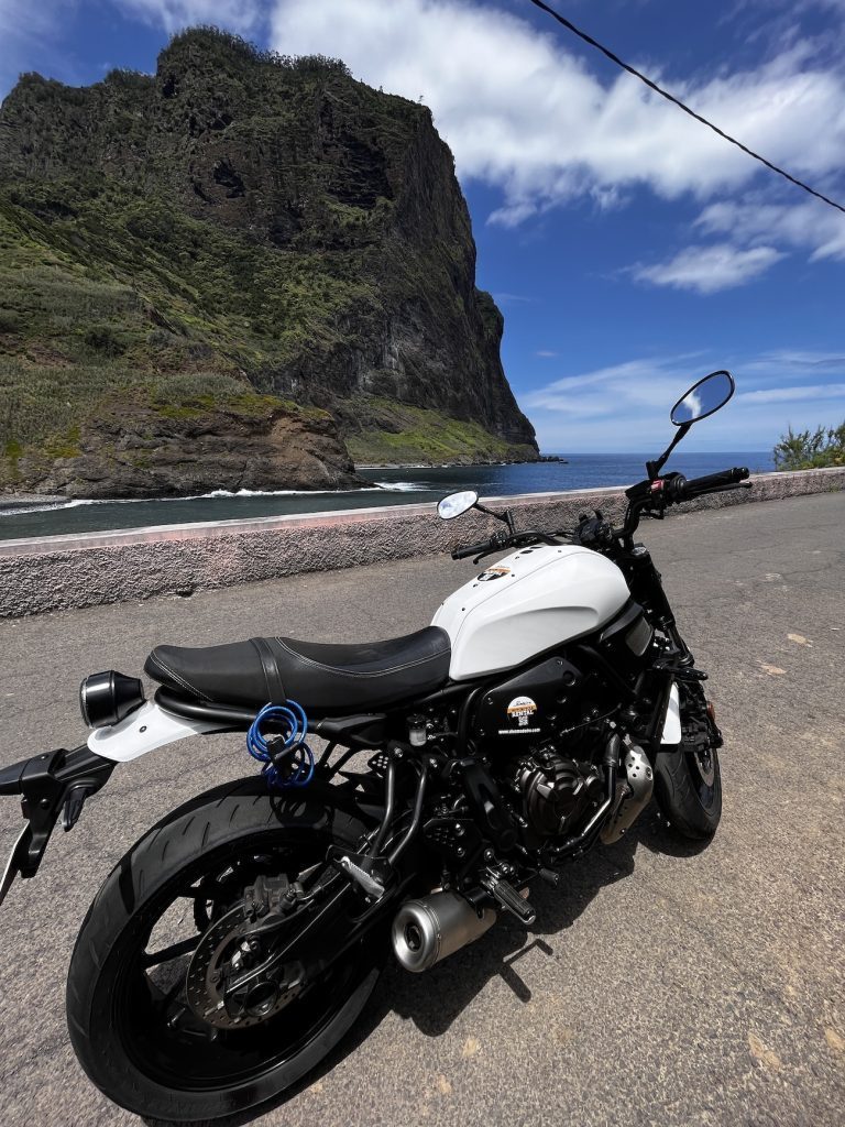 Mój wybór padł na Yamahę XSR 700 – to motocykl, który łączy styl klasycznego roadstera z nowoczesną techniką. W miarę lekki (masa na mokro to około 188 kg), zwinny, a jednocześnie pod manetką drzemie naprawdę spory potencjał. Silnik o pojemności 689 cm³, do tego 75 KM i 68 Nm – wystarczająco, żeby cieszyć się jazdą nawet na wyższych biegach. Wysokość siedziska to około 835 mm, co — jak się szybko okazało — miało dla mnie kluczowe znaczenie. Dosięgałam do ziemi pełnymi stopami, co dawało ogromną pewność przy manewrach na postoju czy w trudniejszym terenie. Opiekun wypożyczalni przedstawiał sprzęt, jakby mówił do totalnego amatora. I o ile oczywiście nie ma w tym nic złego, mimo że wywołało na mojej twarzy lekki uśmiech, to jednak z drugiej strony warto pamiętać, że Madera i jej trasy to zdecydowanie nie jest kierunek dla początkujących motocyklistów.
