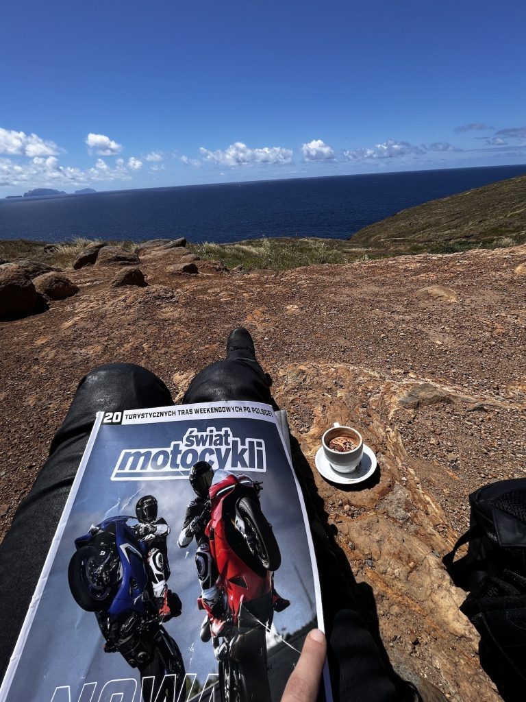 Później dotarłam na najbardziej wysunięty na wschód punkt wyspy – Ponta de São Lourenço. Półpustynny krajobraz, brak drzew, silny wiatr i zapierające dech w piersiach klify. Co ciekawe, to tu można podziwiać najrzadsze foki świata – mniszki śródziemnomorskie, a także endemiczne rośliny i kolonie mew. Teren jest piękny, ale dojazd autem to męka, bo na sam szczyt prowadzi kilkukilometrowy korek. Na motocyklu? Omijamy go, więc jest idealnie. Na szczycie napiłam się mocnej kawy z przydrożnej przyczepki, wyjęłam drukowane wydanie „Świata Motocykli” i w końcu miałam chwilę na nadrobienie braków w lekturze. Odpoczywać za bardzo nie potrafię, więc po dłuższej chwili poczułam, że nadszedł czas, by znów wsiąść na motocykl i pojechać dalej.