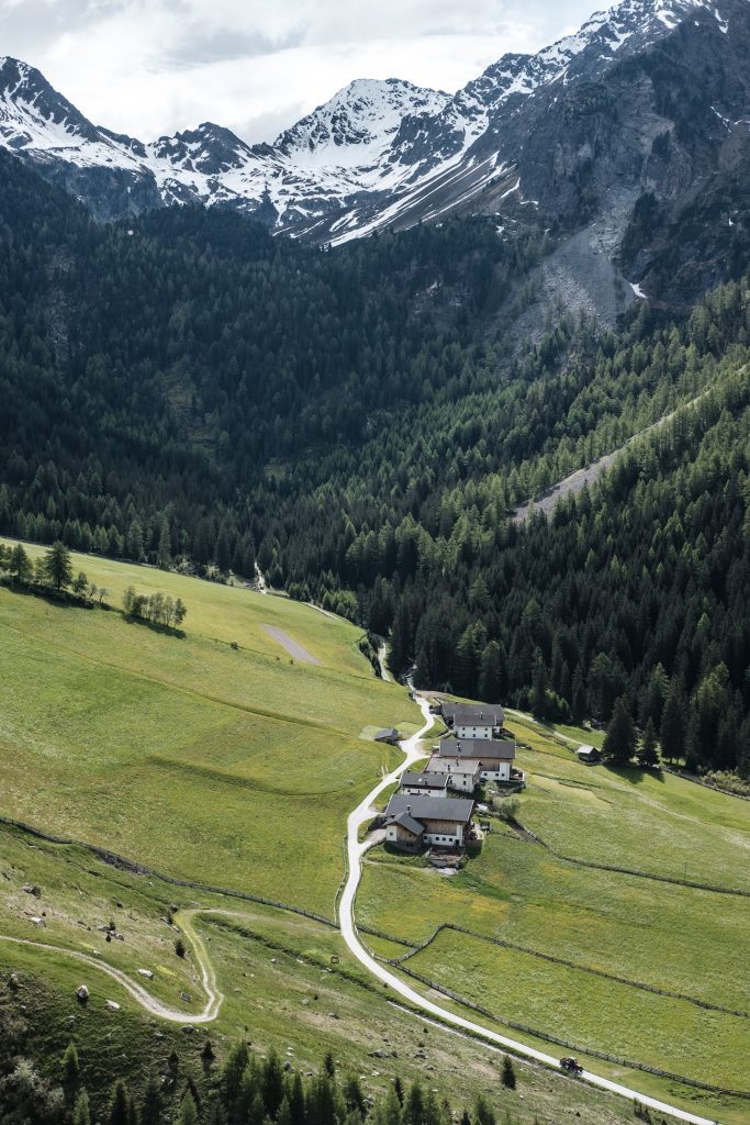 W drodze na Penser Joch od południa można zwariować. A gdzieś w połowie podjazdu są takie właśnie widoki na niemal odizolowane w dolinach domostwa.