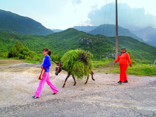 Ta część kraju uzmysłowiła mi, jak ważny w gospodarce Albanii jest do dziś osiołek. To sympatyczne stworzenie występuje tu w wielu odmianach. Najbardziej popularna jest wersja transportowa. Kiwająca się kopa siana, słomy lub bateria plastikowych baniek i zbiorników ? to lokalna wersja pikapa. Częsta jest wersja sportowa, dosiadana okrakiem bądź bokiem przez miejscowych dżokejów. Grzesiek z Pawłem, za czekoladowego batona, zasiedli za „sterami” takiej odmiany, nie zdejmując dla bezpieczeństwa motocyklowych kasków. Ostatnia ze znanych mi wersji, popularna również u nas, to wersja spożywcza, serwowana jako salami.