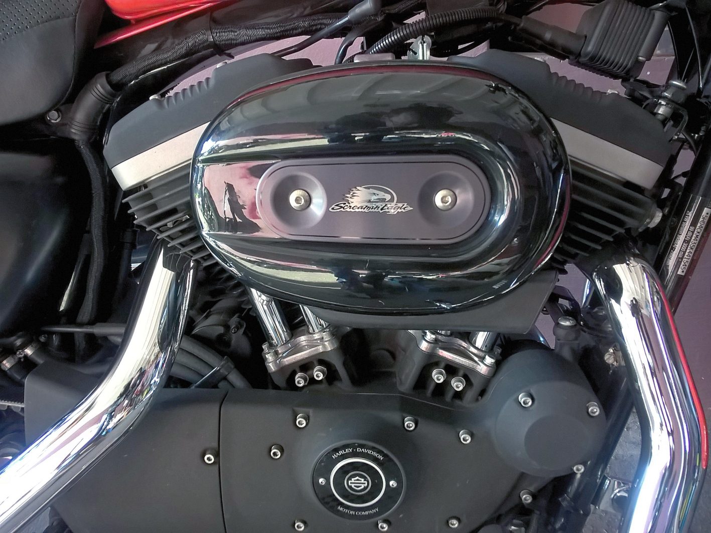 To motocykl wyśmienity dla ludzi lubiących majsterkować. Na rynku jest mnóstwo akcesoriów producentów z całego świata. Można szybko zmienić stylistykę, zawieszenie, a także łatwo zmodyfikować silnik. Jedynym minusem są ceny dobrych części, ale jeśli się kocha swoją zabawkę… Z czasem i na akcesoria magicznie gotówka się znajdzie. Mój Sportster powinien mieć 54 konie i 70 Nm momentu obrotowego, ale jest chyba inaczej. Nie było okazji odwiedzić hamowni, lecz jeździłem na wielu motocyklach i sądzę, że mocy i momentu jest więcej. Oryginalny podciśnieniowy gaźnik o przelocie 38 mm przez poprzedniego właściciela został zmieniony na mechaniczny gaźnik Mikuni HSR 42. Układ wydechowy też jest zmieniony – nie dławi motocykla. Trudno powiedzieć, czy cylindry nie zostały zmienione bądź rozwiercone (musiałbym zdjąć głowicę, żeby się tego dowiedzieć). Tak czy owak, mój 883R na pierwszym biegu i suchej nawierzchni bardzo łatwo zrywa przyczepność, osiąga w granicach 200 km/h (odbiornik GPS wskazał 189 km/h, przy czym jeszcze lekko się rozpędzał, ale ja miałem już dość – brak owiewek skutecznie wybija z głowy takie testy, oczywiście na torze…).