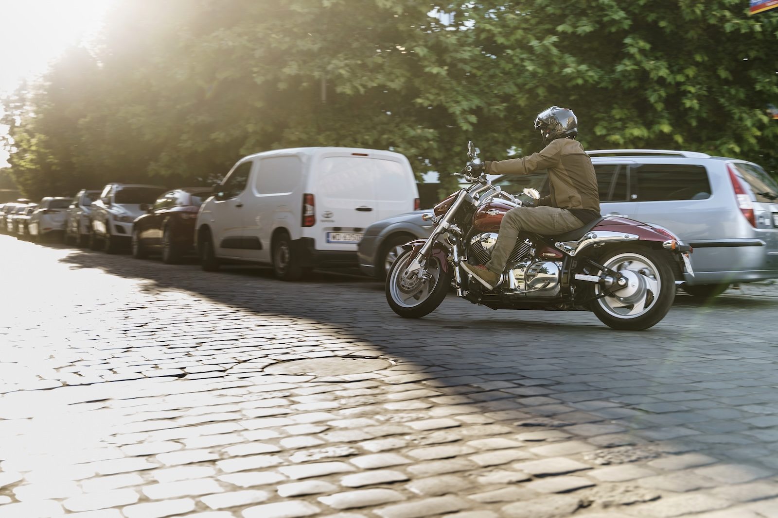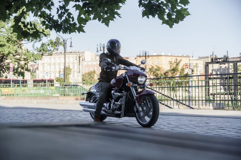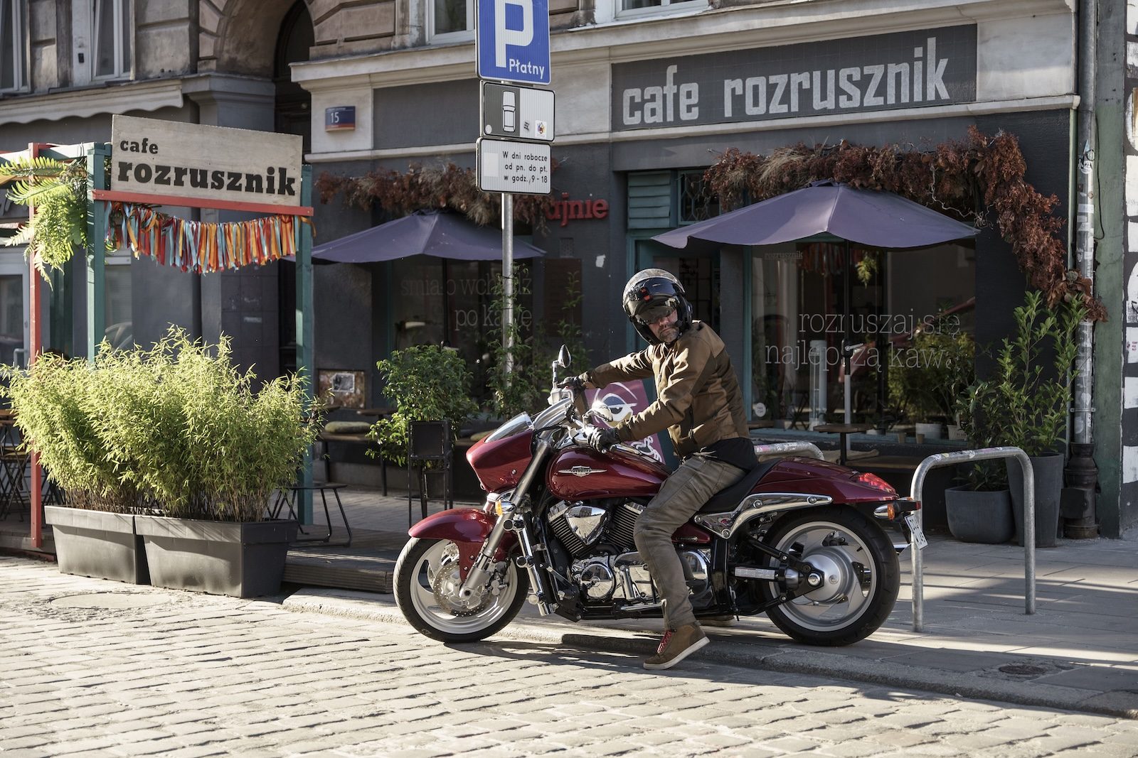 Na wprost VZ1500 jedzie jak po sznurku. Idealny do autostradowych przelotów, kiedy można docenić solidny moment obrotowy i stabilność. Gorzej z ochroną przed wiatrem ale powercruiserem jeżdżą przecież tylko prawdziwi mężczyźni a tacy biorą wszystko na klatę. Nawet wiatr i komary. W zakrętach masa jest wyczuwalna, motocykl lubi się „położyć” w łuku i trzeba go trzymać. W szybkim zakręcie nie ma mowy o lekkości – musisz go pilnować do samego wyjścia. W mieście? O dziwo radzi sobie całkiem dobrze. Rozstaw osi krótszy niż w M109R, kierownica szeroka – dzięki temu manewrowanie nie jest aż tak uciążliwe. Nowicjuszom ta potężna masa i szeroka tylna guma mogą sprawiać problemy.