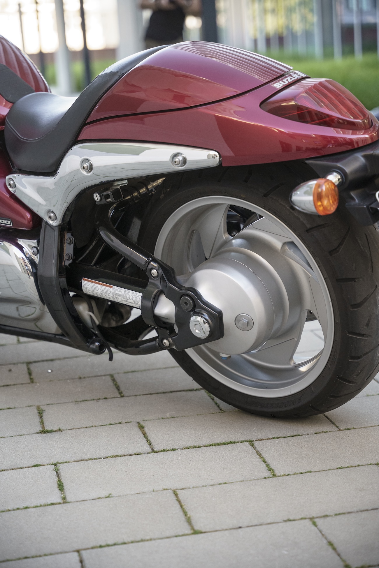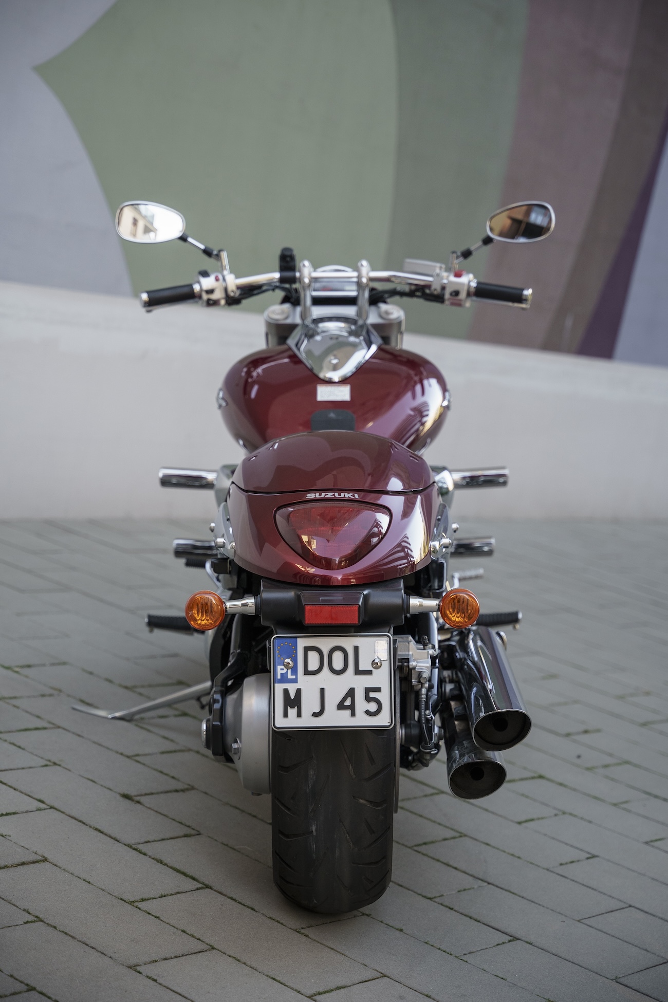 Z tyłu mamy oponę 200/50 R17. Wygląda to dobrze… no dobra, nawet bardzo dobrze. Tyle że w praktyce ten rozmiar robi robotę tylko na postoju i może służyć najwyżej do lansu pod knajpą. W zakrętach nie pomaga, a wręcz przeszkadza – motocykl trzeba mocniej prowadzić, a składanie idzie jak po grudzie. Pamiętam moje początki z większym bratem Intrudera. Miałem wrażenie, że tona żelaza wypycha mnie na orbitę przy pomocy silnika odrzutowego. Trajektoria jest odgórnie zadana i raczej nie ma mowy o jej zmianie.