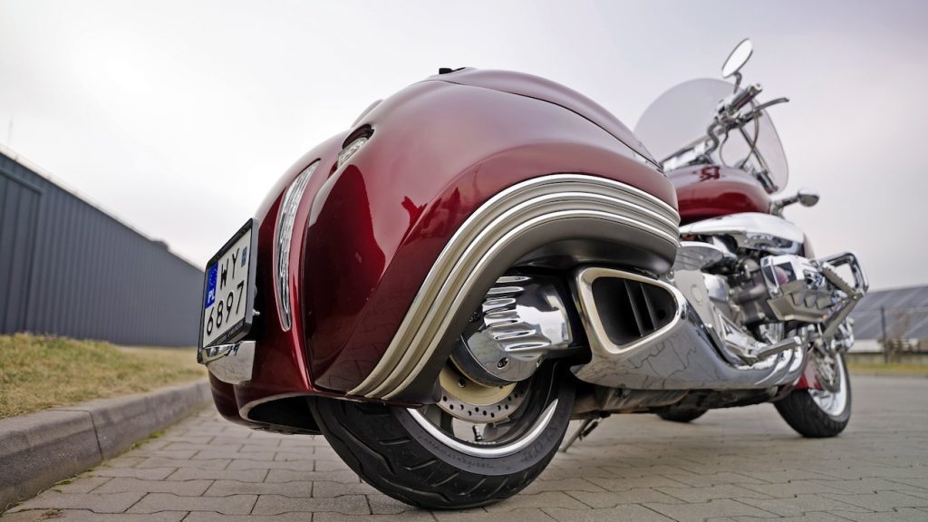 Sam dźwięk też robi ogromne wrażenie. Szczególnie w przypadku akcesoryjnego układu wydechowego marki Rivco, który zastosowano w jednym z prezentowanych egzemplarzy. Sześć cylindrów i sześć rur wydechowych! Kaskada dźwięków, wręcz otacza kierowcę z każdej strony. Choć doznania akustyczne wynoszą nas na zupełnie nieznany dotąd poziom, to jest również pewna wada takiego rozwiązania. Nie każdy akceptuje modyfikacje Hondy Rune. Puryści twierdzą, że ten motocykl jest sam w sobie jeżdżącym dziełem sztuki i w tym przypadku jakiekolwiek ingerencje w jego wygląd są po prostu świętokradztwem. O ile akcesoryjny wydech Rivco brzmi nieziemsko, to muszę się zgodzić, że trochę zaburza naturalną, piękną linię Rune.
