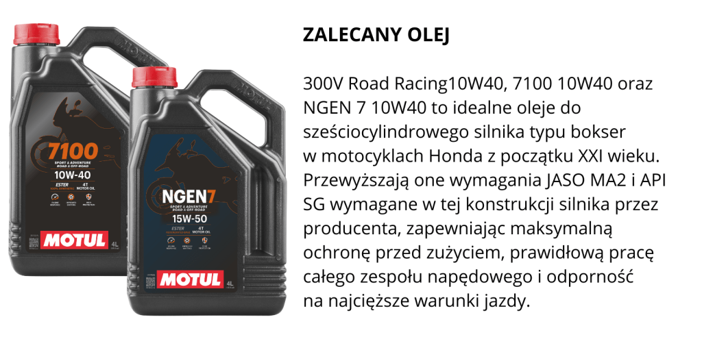 Jedynym poważnym podzespołem, współdzielonym z innymi modelami Hondy, jest potężny silnik. Sześciocylindrowa jednostka napędowa typu flat six, czyli tzw. płaska szóstka, to dokładnie taki sam silnik, jaki był stosowany w tamtym czasie w turystycznej Hondzie Gold Wing 1800. Moc maksymalna na poziomie 118 KM dziś nie robi już na nikim wrażenia. Moment obrotowy wynoszący 167 Nm już może trochę bardziej, ale nadal nie jest to szokująca wartość. Imponuje za to gładkie, wręcz jedwabiste oddawanie mocy. Ten sposób pracy silnika trudno porównać do jakiegokolwiek innego dostępnego na rynku. Do dyspozycji mamy 5-biegową skrzynię i oczywiście przeniesienie napędu za pośrednictwem wału, tak jak w Gold Wingu.